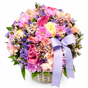 Blueberry-Pink Roses In Rattan Bag