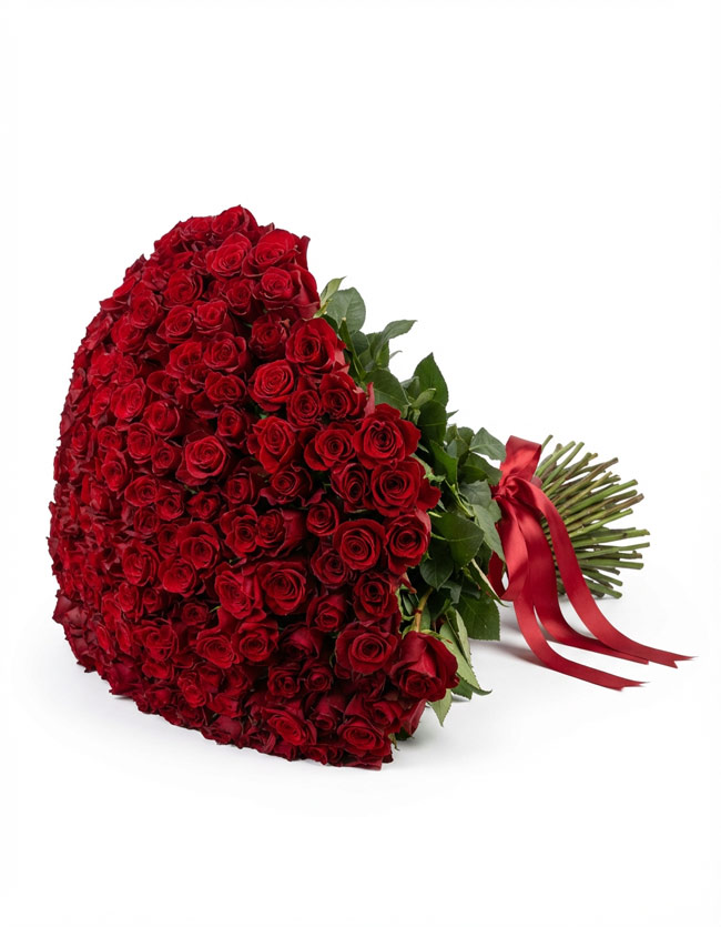 A bold expression of love, passion, and devotion. This luxurious bouquet features 101 hand-selected red roses, arranged in a full, round composition that makes an unforgettable statement. Each rose is chosen for its rich color, perfect bloom, and freshness, creating a breathtaking display that speaks without words.
