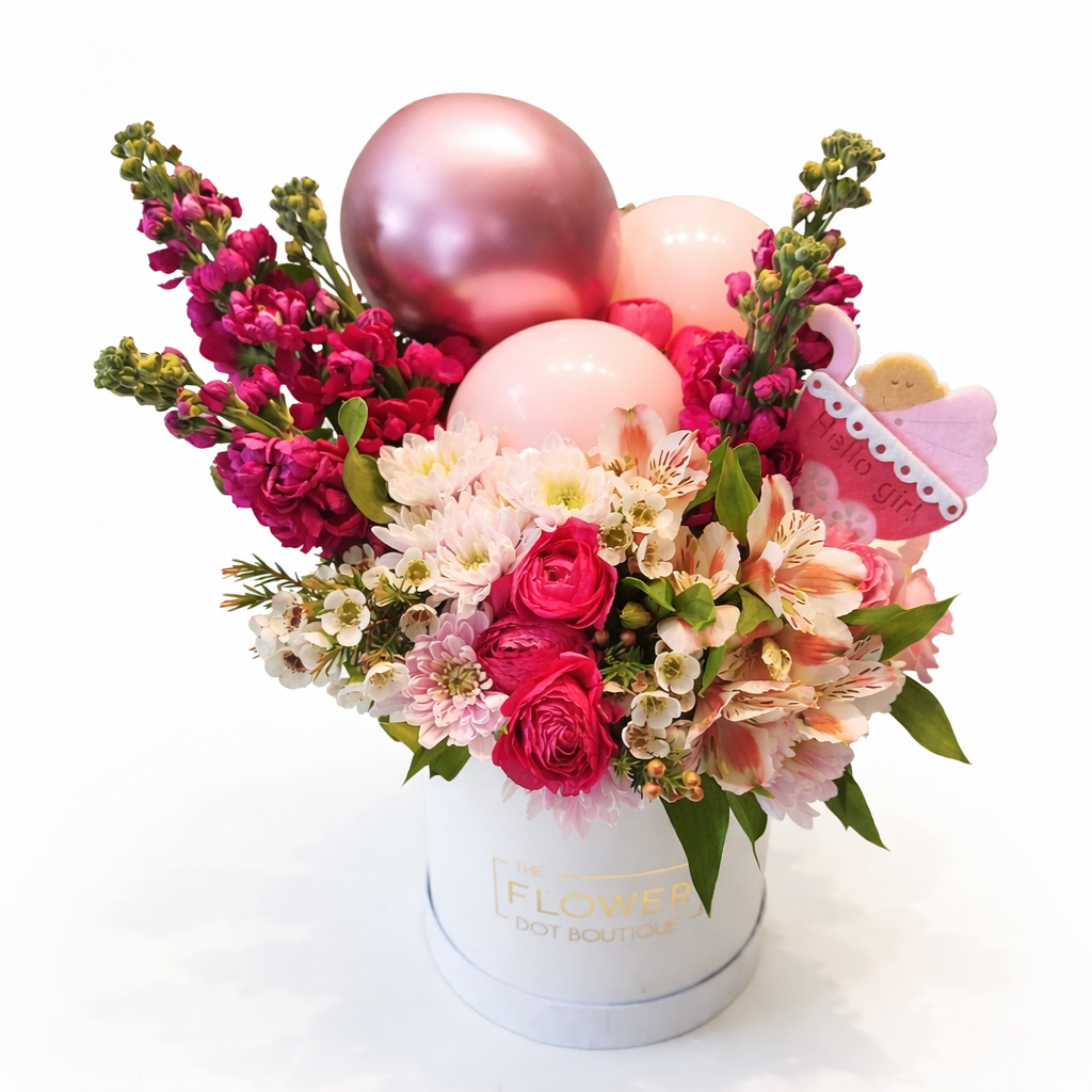 The Floral Balloon Deluxe is a sweet and elegant gift for a newborn, featuring fresh flowers in soft colors and cheerful balloons. Perfect for welcoming a baby with love and care, or for a baby shower, suitable for all genders.