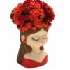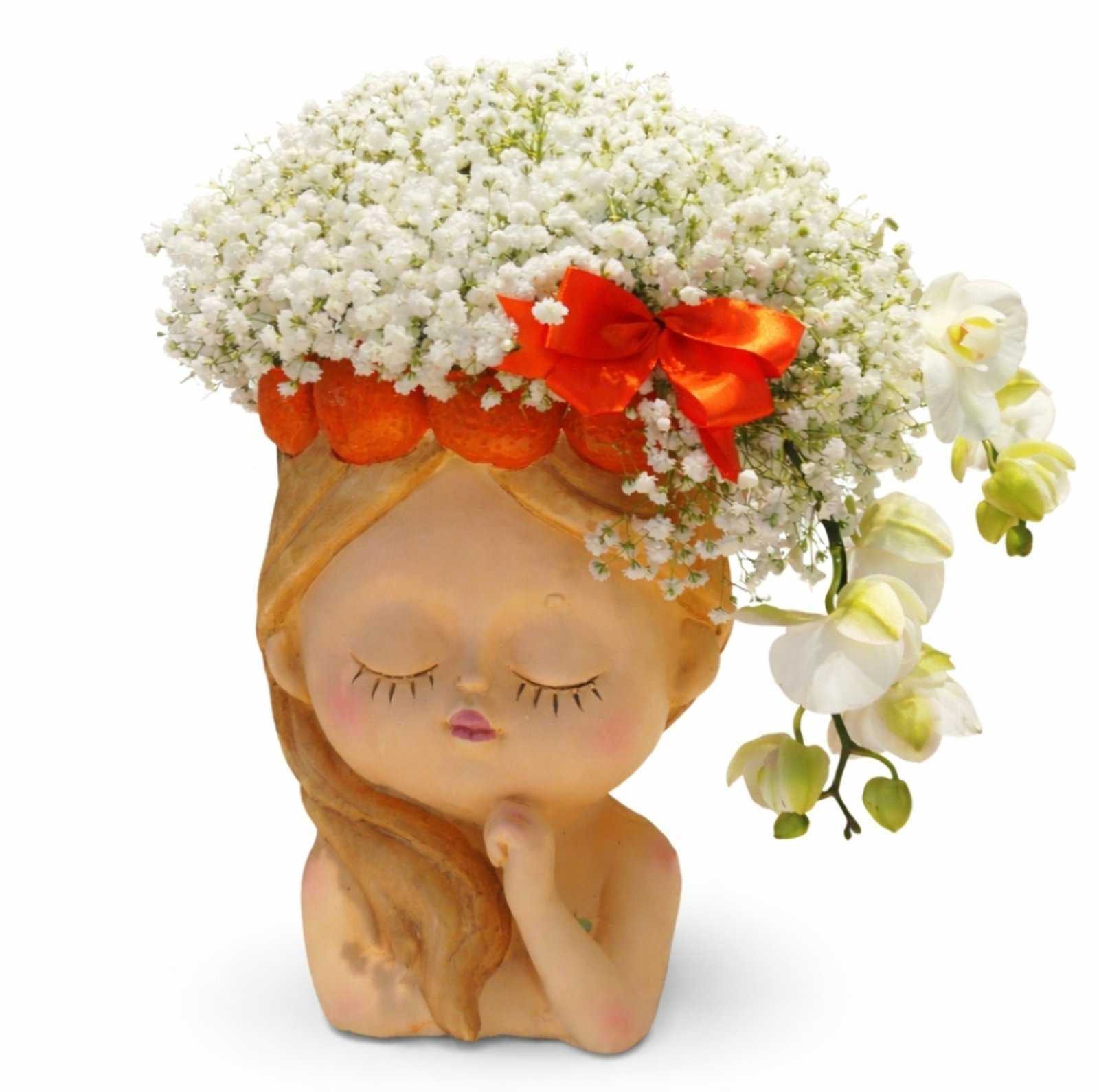 A gentle face adorned with fresh blooms, as if nature itself painted her cheeks in soft pinks.