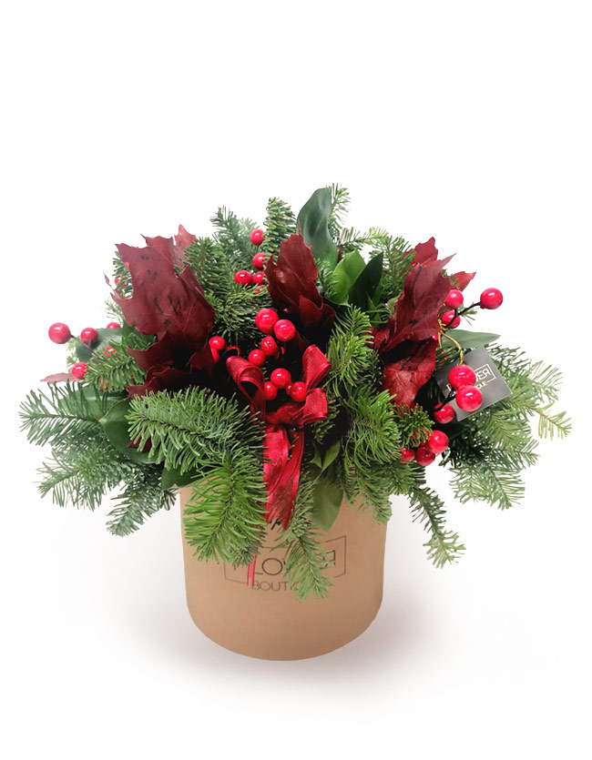 This Christmas holiday send your warm wishes with this beautiful festive composition in a flower box.