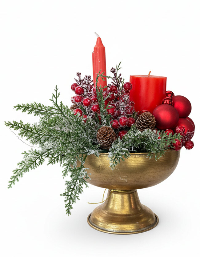 Beautiful artificial stems combined with a candle and sparkling holiday balls. Ideal for holiday decorating or as a thoughtful festive gift.