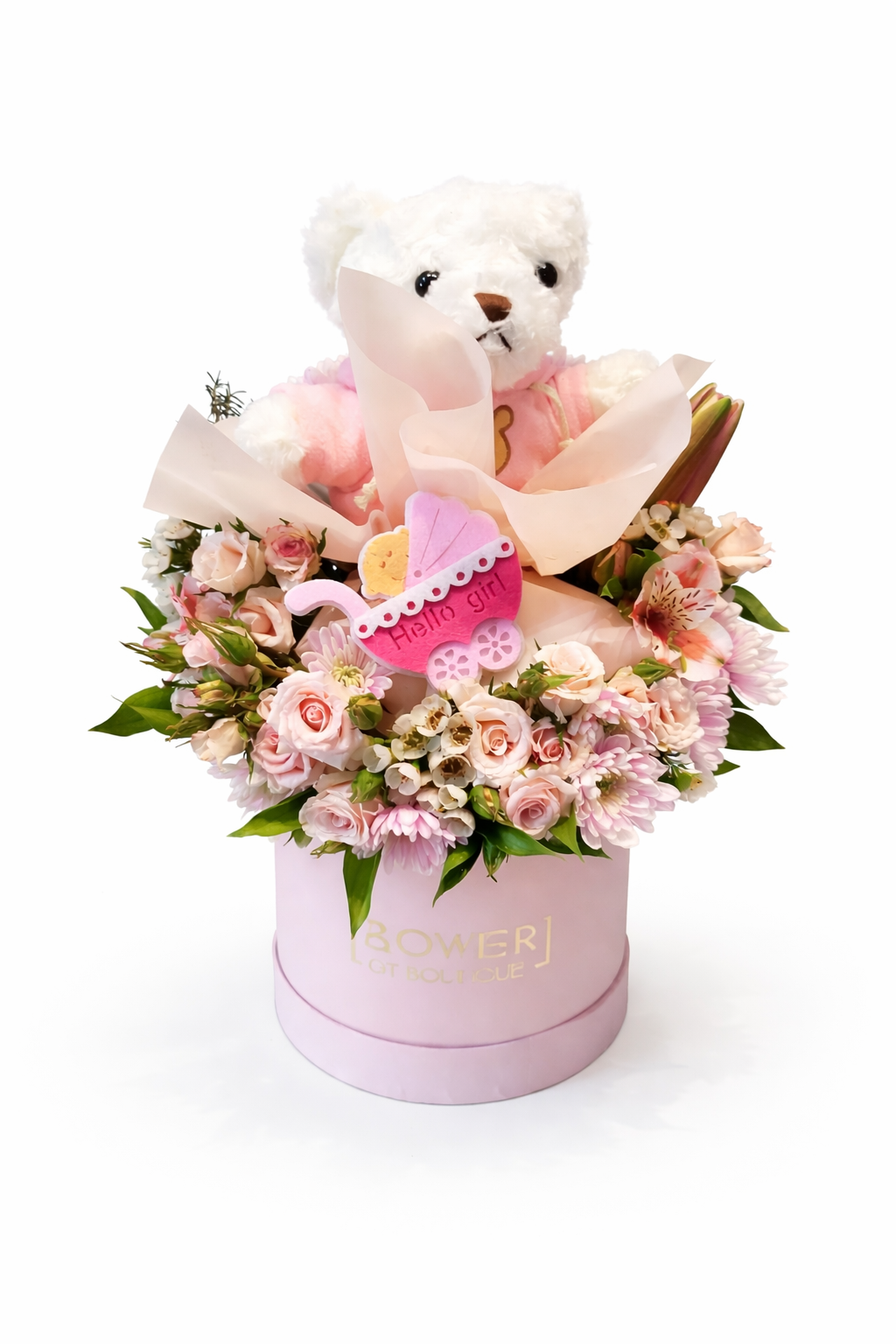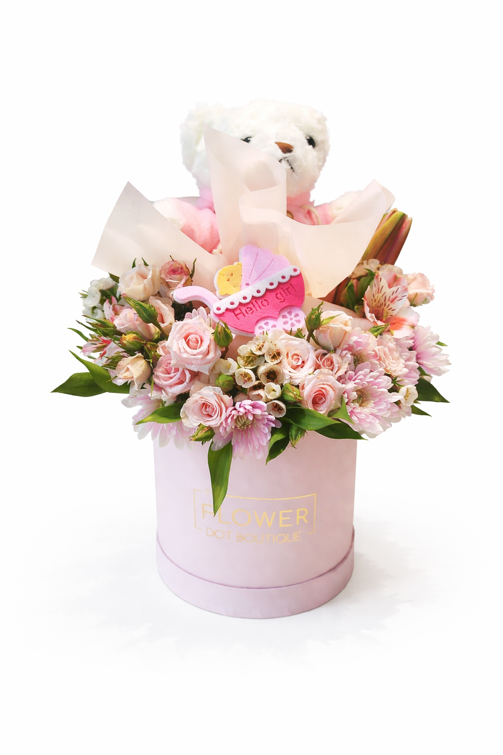 The Floral Teddy Deluxe is a beautiful box with fresh flowers in pink or blue shades and a sweet teddy bear.