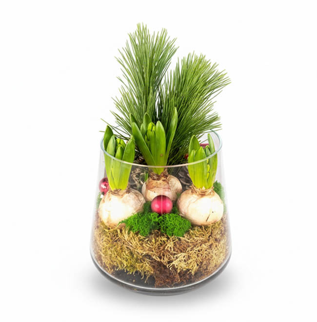 Glass jar with hyacinths, moss, pine, pinecones, and Christmas baubles. Perfect for decoration or as a gift for your loved ones. As the hyacinths grow, they fill the air with a magical fragrance