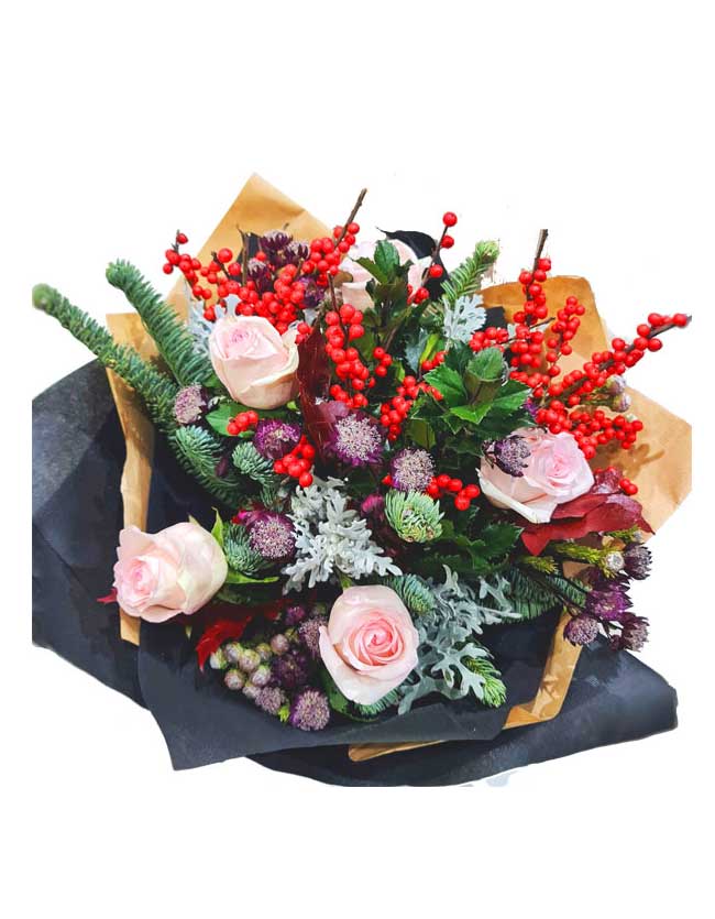 A luxurious long stem Christmas arrangement with a combination of some of the finest festive long lasting Christmas greenery and flowers.