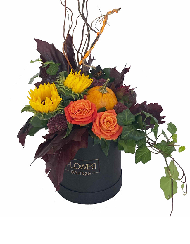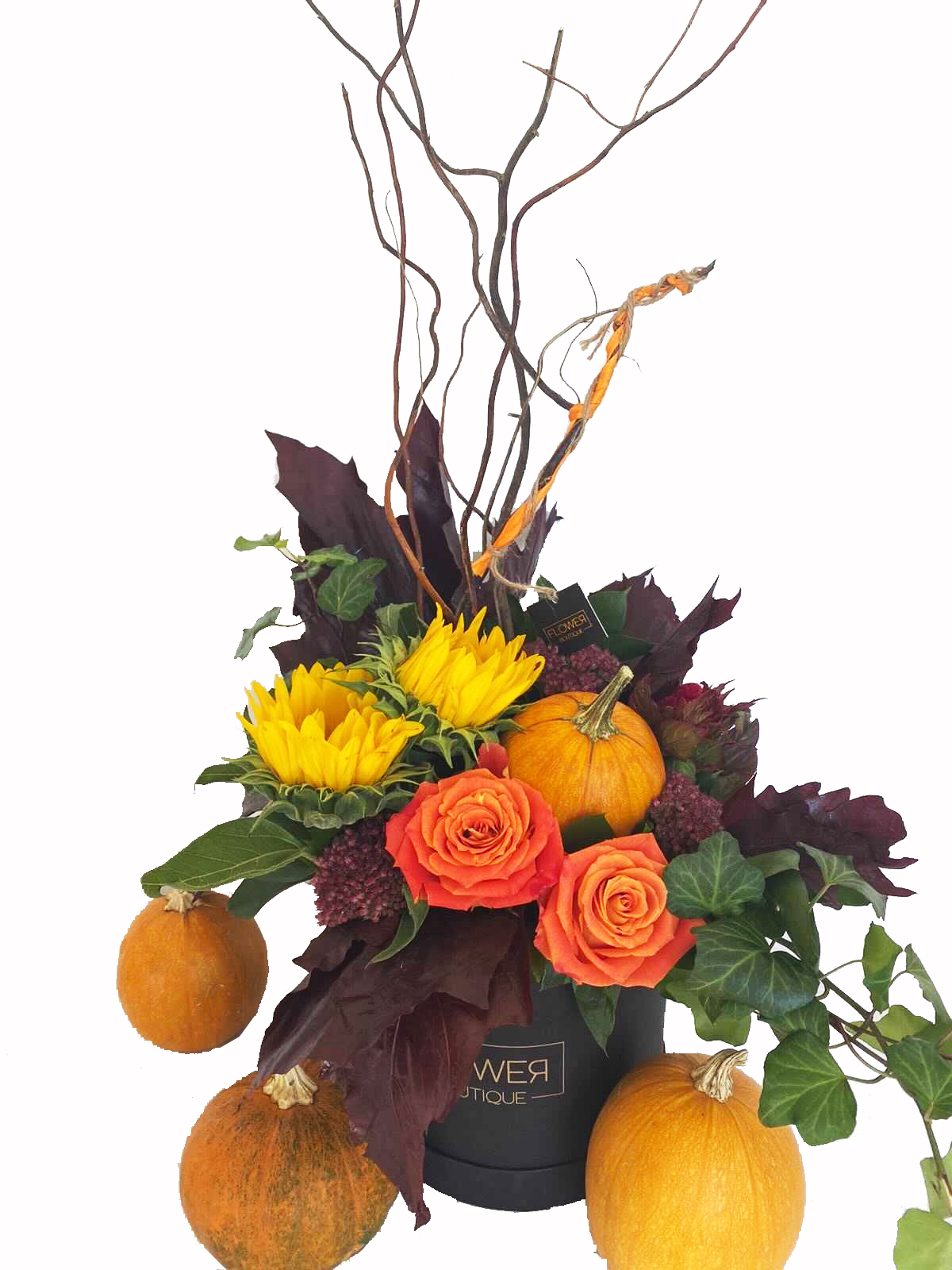 Halloween box is a wonderful autumn gift for your home and for your loved ones, featuring pumpkin, roses, sunflowers and greenery.