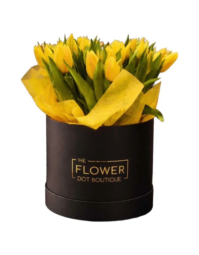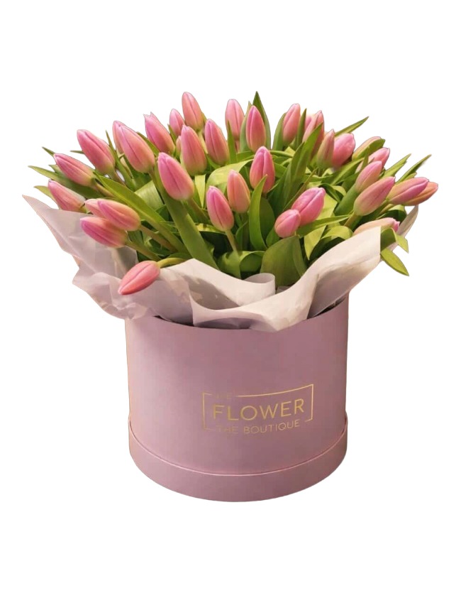 A luxurious bouquet of 45 fresh tulips beautifully arranged and presented with an included glass vase.