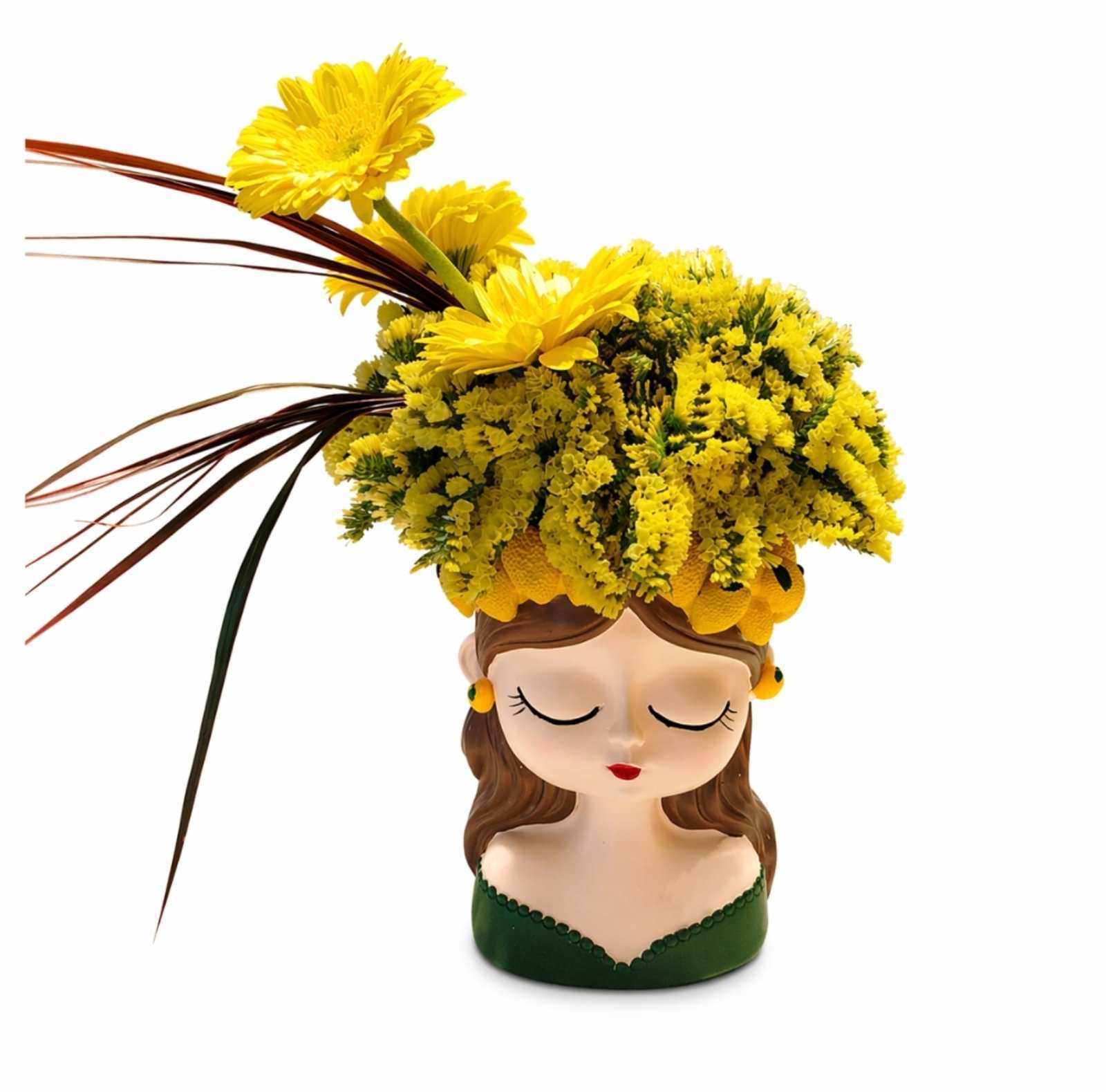 A yellow face pot with fresh flowers on top. It looks bright, simple, and happy.