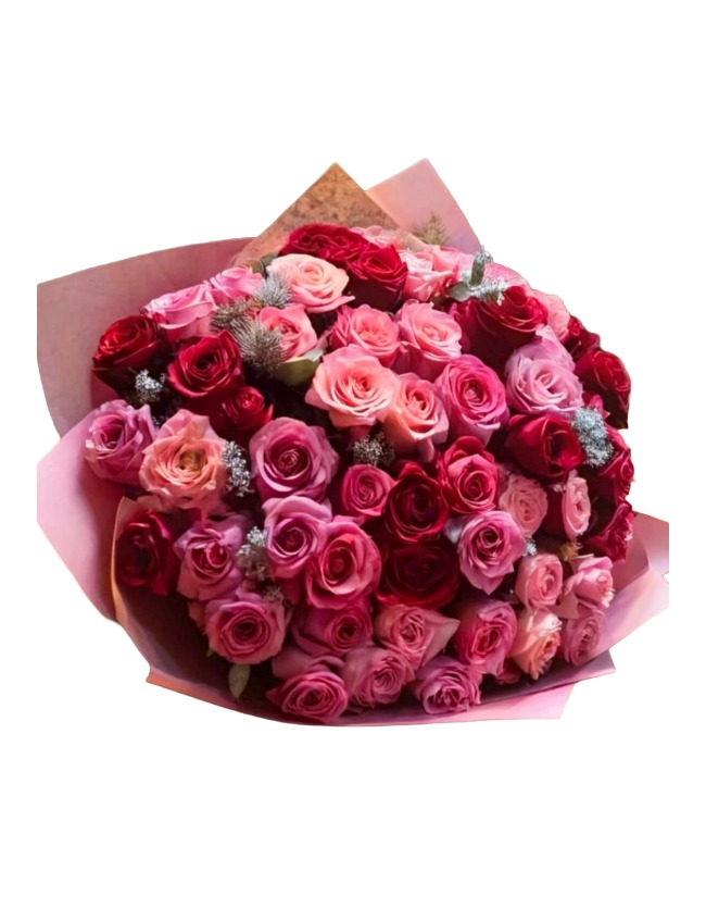 This large luxury bouquet features 41 premium roses in a rich mix of colours, romantic shades of pink, deep red, soft peach, and delicate blush, artfully combined with fresh seasonal greenery for natural movement and depth. The blend of tones creates a harmonious, multi-dimensional arrangement that feels both bold and refined.