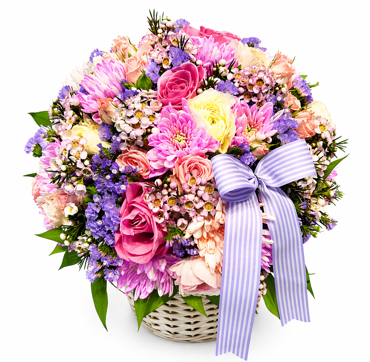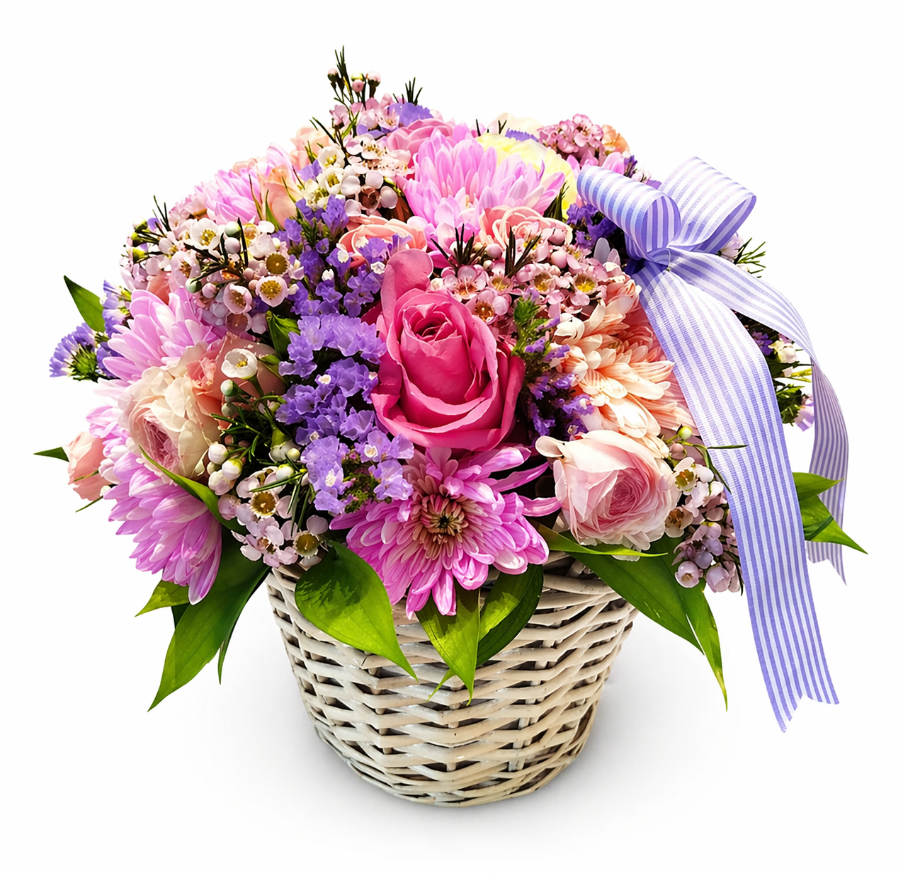 A delicate basket of soft blooms, lovingly arranged to feel like a warm hug in flower form—perfect for showing Mom just how much she means to you for Mother’s Day.