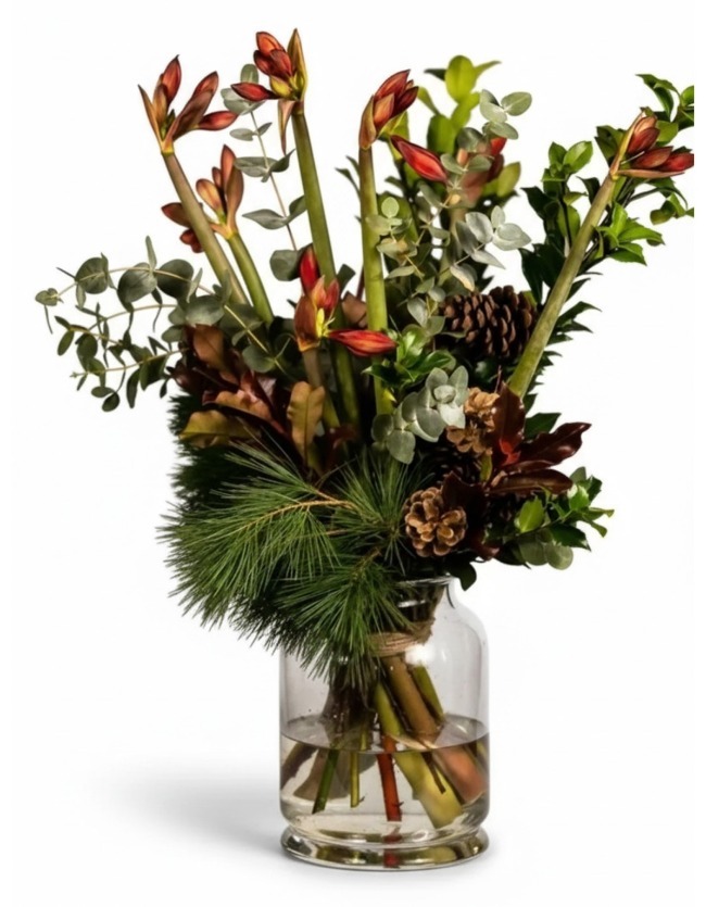Seasonal red christmas fresh flowers ( eucalyptus,branches,nobilis,amaryllis,pine cones,pines,conifer)(Includes glass vase )
