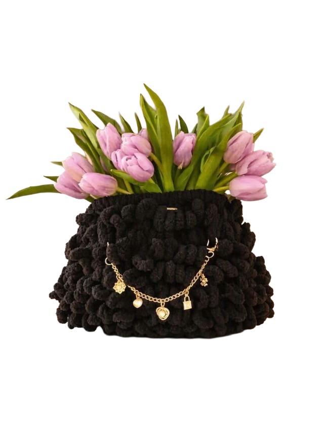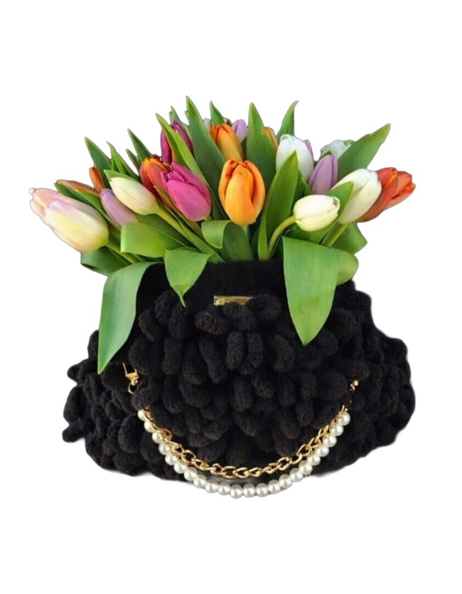 The Tulip Bloom Bag is a handmade statement piece that blossoms with vibrant tulips. Elegant pearl and chain details add a touch of romance and luxury. As each bag is uniquely crafted, accessories may vary and cannot be individually selected. Inside the bag is a glass vase filled with water to keep the tulips fresh and beautifully in bloom.