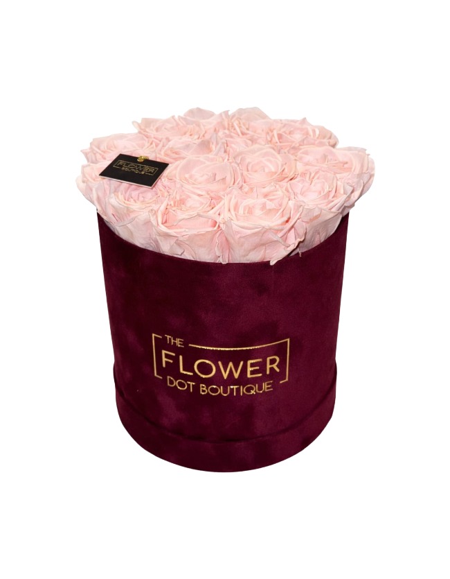 A Velvet box of 15 stunning, carefully chosen preserved pink roses. These roses can last up to 3 years