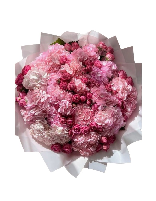 This huge premium bouquet features 30 heads of hydrangeas in two harmonious shades, creating a soft, cloud-like volume, beautifully complemented by 9 delicate spray roses that add texture, depth, and refined contrast. Every stem is hand-selected and arranged to achieve a perfectly rounded, luxurious silhouette.